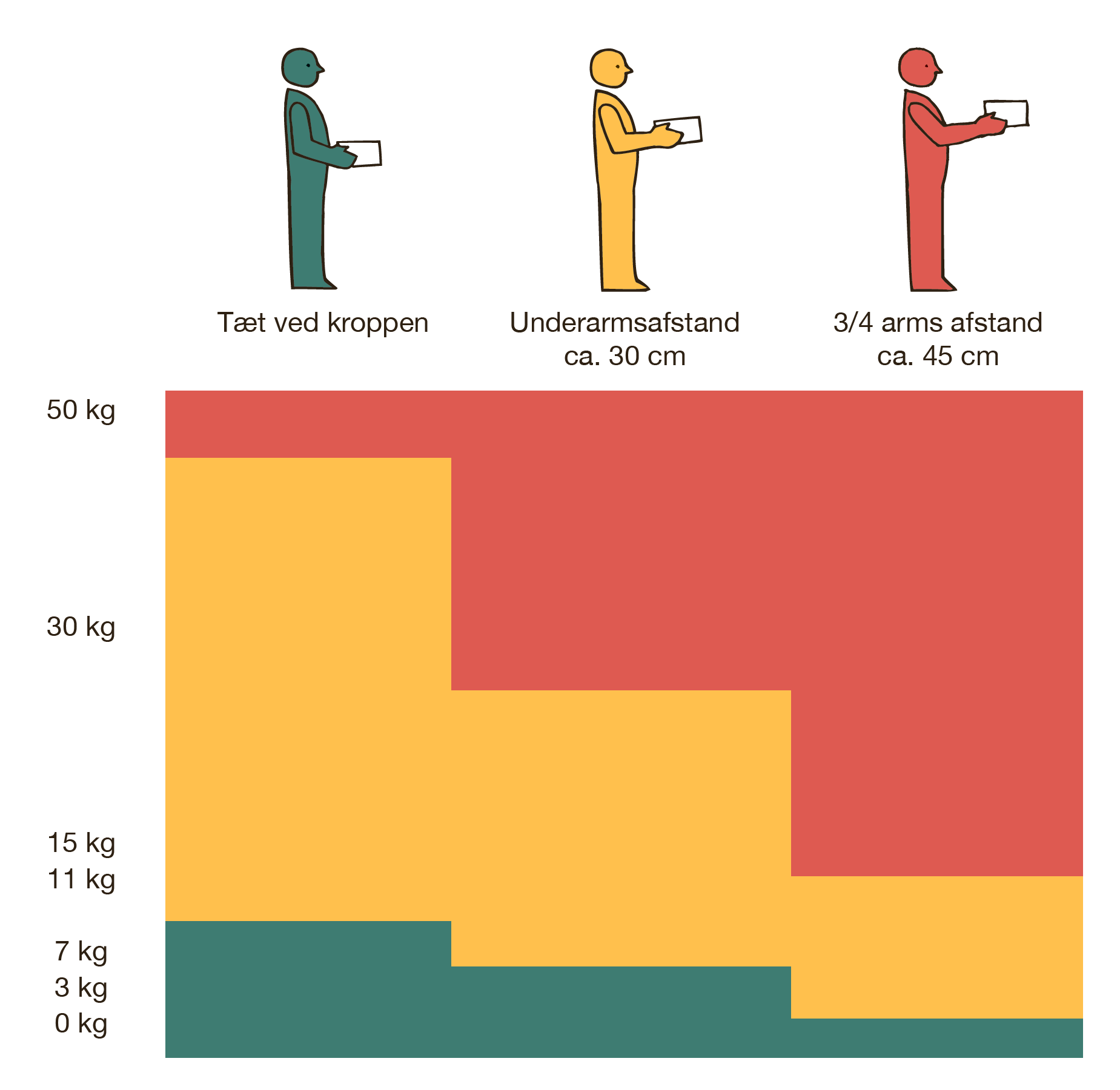- Løft og bær byrden symmetrisk, dvs. midt foran kroppen eller fordelt ligeligt i begge hænder