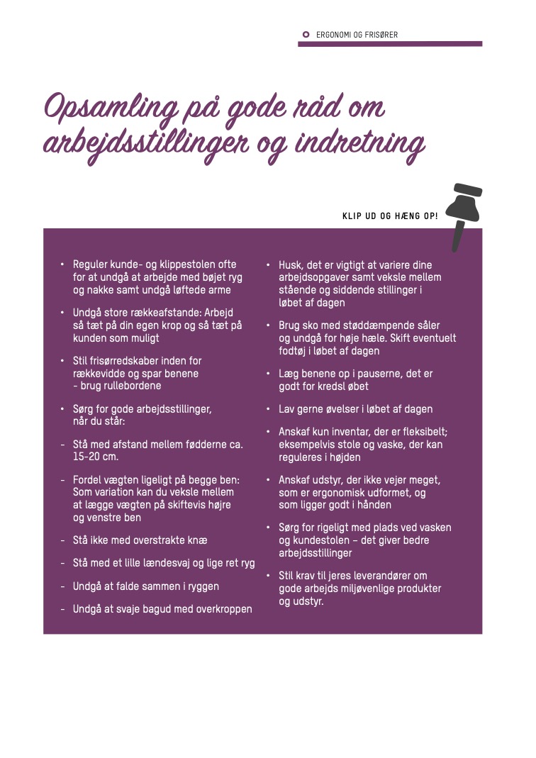 - Reguler kunde- og klippestolen ofte for at undgå at arbejde med bøjet ryg og nakke samt undgå løftede arme