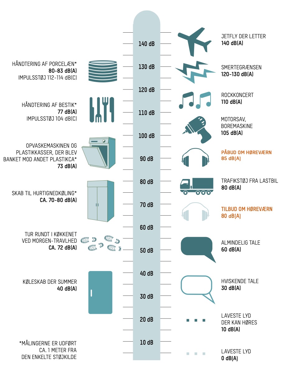 På modsatte side giver eksempler på støjniveauer i køkkener. Til sammenligning er angivet en række andre støjniveauer fra hverdagen.