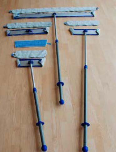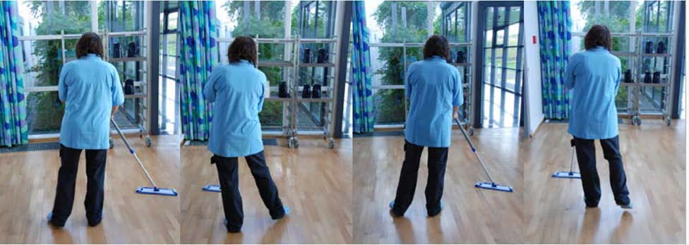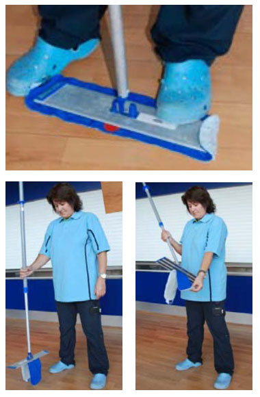 - Ved store brede arealer vil det lette arbejdet med en bred moppefremfører på f.eks. 120 cm, der skubbes foran kroppen (tørmopning).