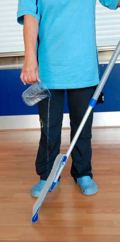 Afhængigt af moppetype, gulvtype og gulvets tilstand anvendes slet ingen vand eller meget lidt vand med eller uden rengøringsmiddel.