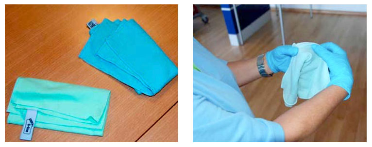 Til inventarrengøring anbefales også fugtige eller tørre komposit-/mikrofiberklude anvendt med foldemetoden. [Kludene kan foldes så der er 8, 12 eller 16 sider. Når en side er snavset, vendes en ren side frem. Når alle sider er brugt, lægges den til vask, og der tages en ren klud.]