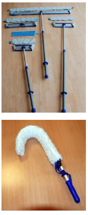 Et andet godt redskab er det viste redskab til bl.a. aftørring af støv. Som det fremgår, kan redskabet bukkes og formes, så det kan tilpasses den flade, der skal tørres af. Længden af redskabet betyder også, at det bliver nemmere at arbejde med armene under skulderhøjde og med korte rækkeafstande.